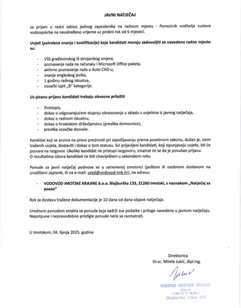 Javni natječaj za prijem u radni odnos