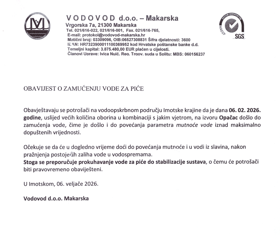 Obavijest o zamućenju vode za piće